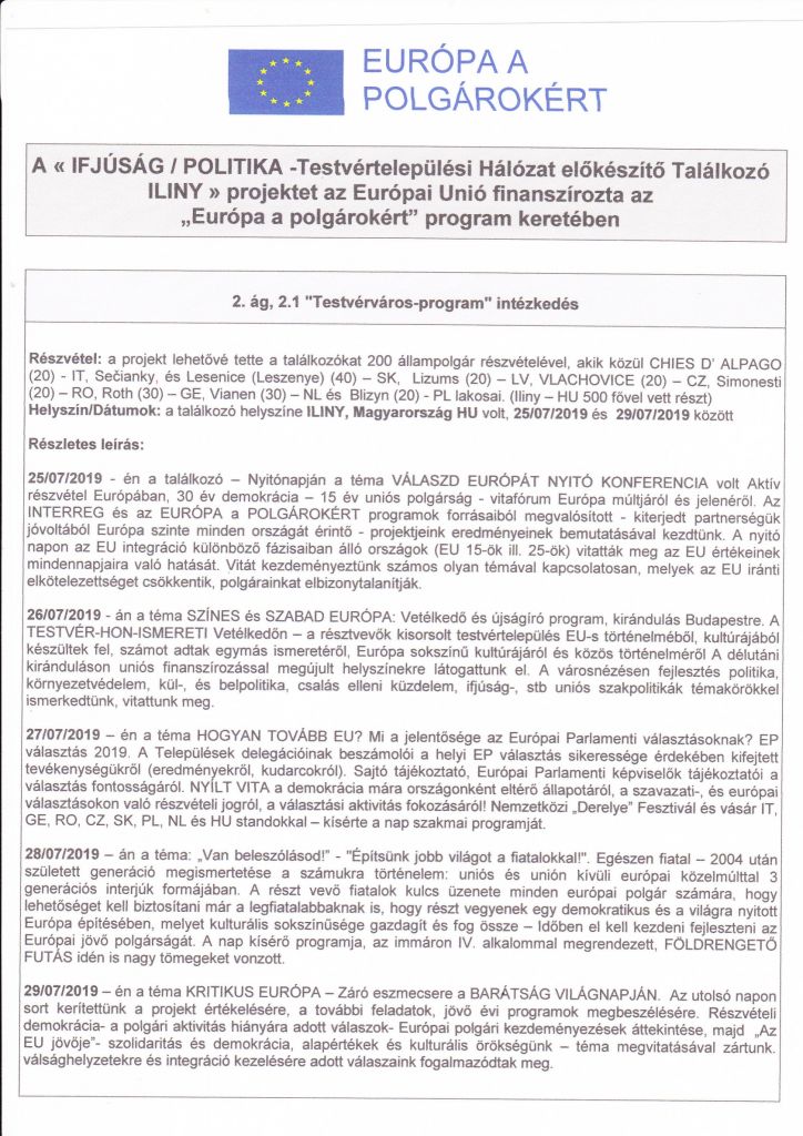 A ifjúság /politika - Testvértelepülési Hálózat előkészítő Találkozó ILINY 25.07.2019-29.07.2019